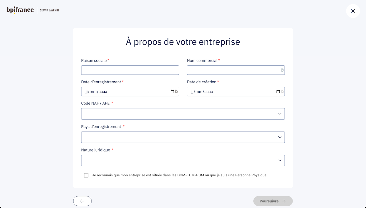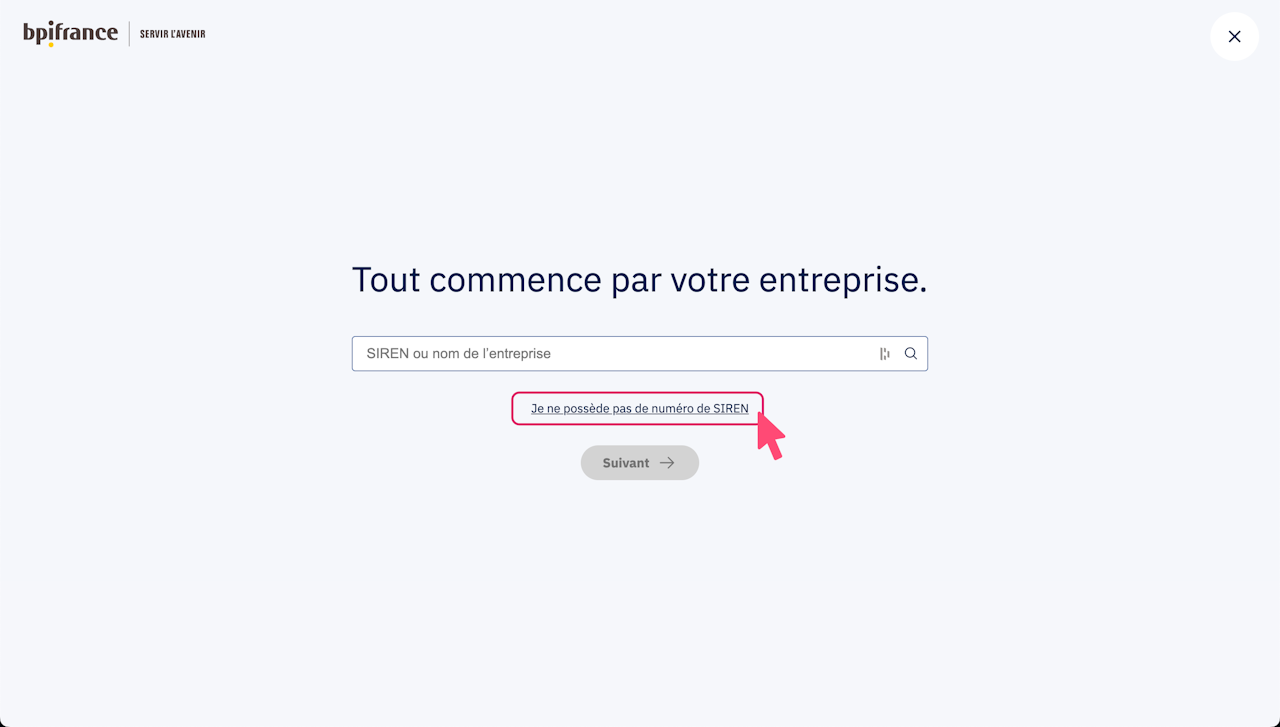 Si vous n’avez pas de SIREN, que votre entreprise est localisée dans les DOM-TOM-POM ou que vous êtes une personne physique, suivez Je ne possède pas de numéro de SIREN et compléter les informations de votre entreprise !