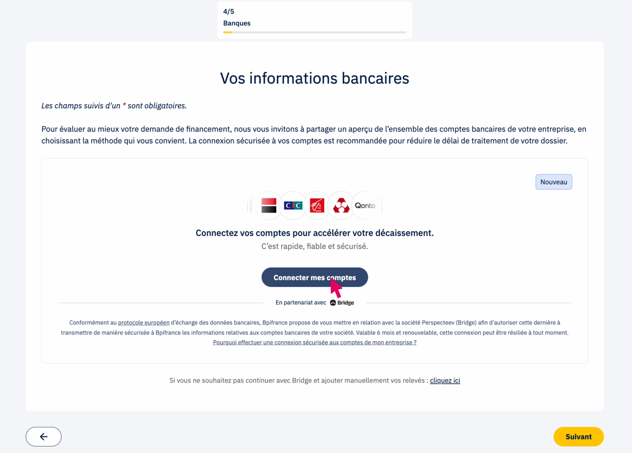 Lors de la complétion de votre dossier, Bpifrance vous invite à connecter vos comptes bancaires afin d'adapter son offre à vos besoins et activités.
