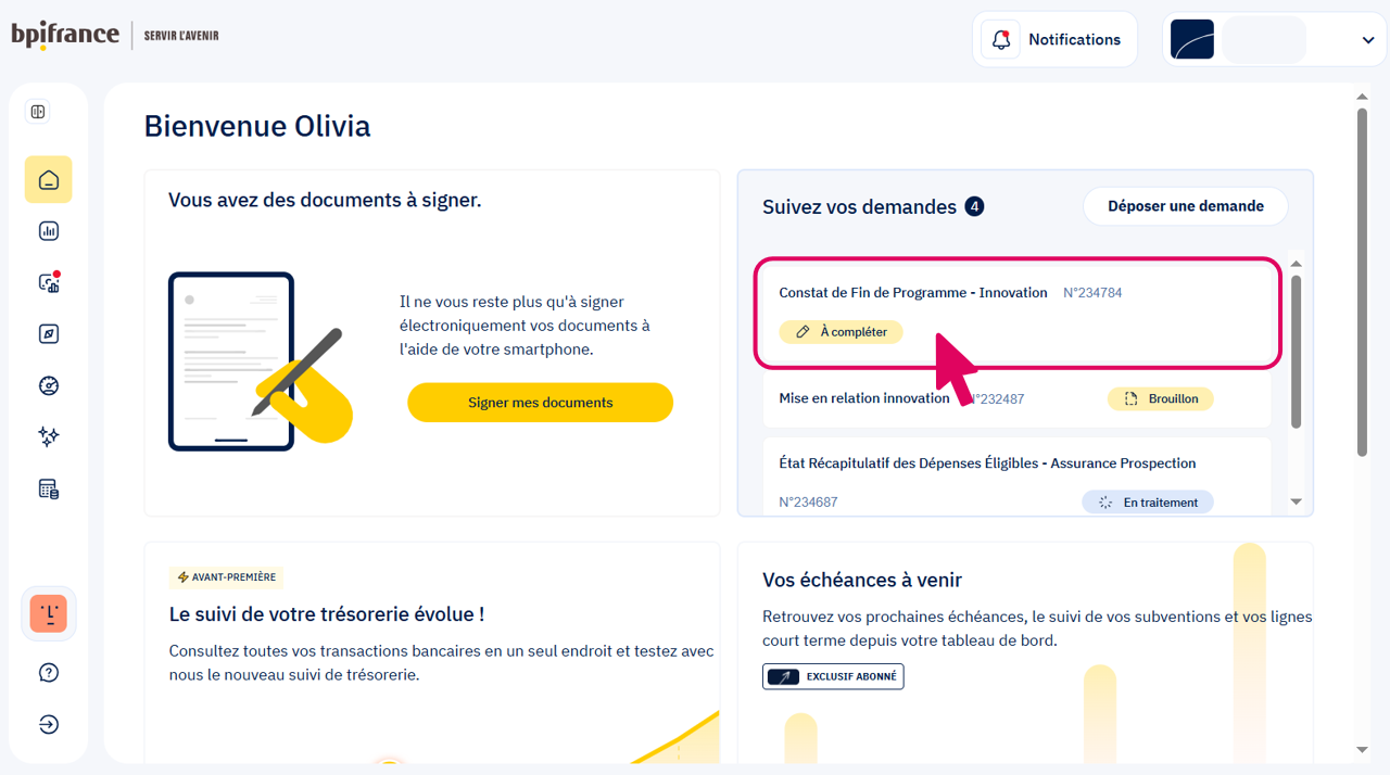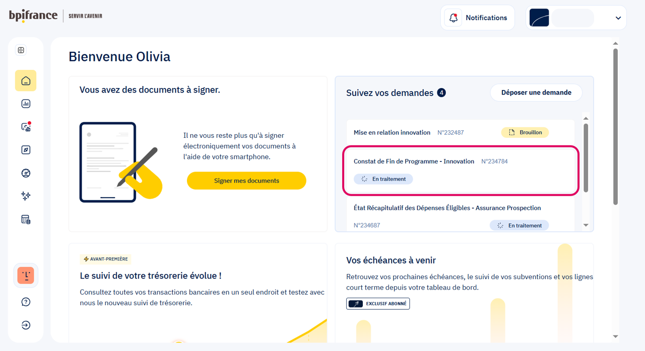 Après vous être connecté à votre espace Bpifrance en ligne, retrouvez la sur votre tableau de bord dans Suivez vos demandes.