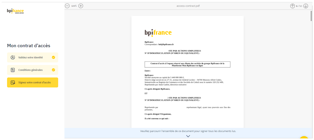 Le contrat d'accès généré lors de la validation de votre identité permet à toute personne morale ou physique de déposer des demandes de produits ou de services au sein du groupe Bpifrance depuis son espace client sécurisé.