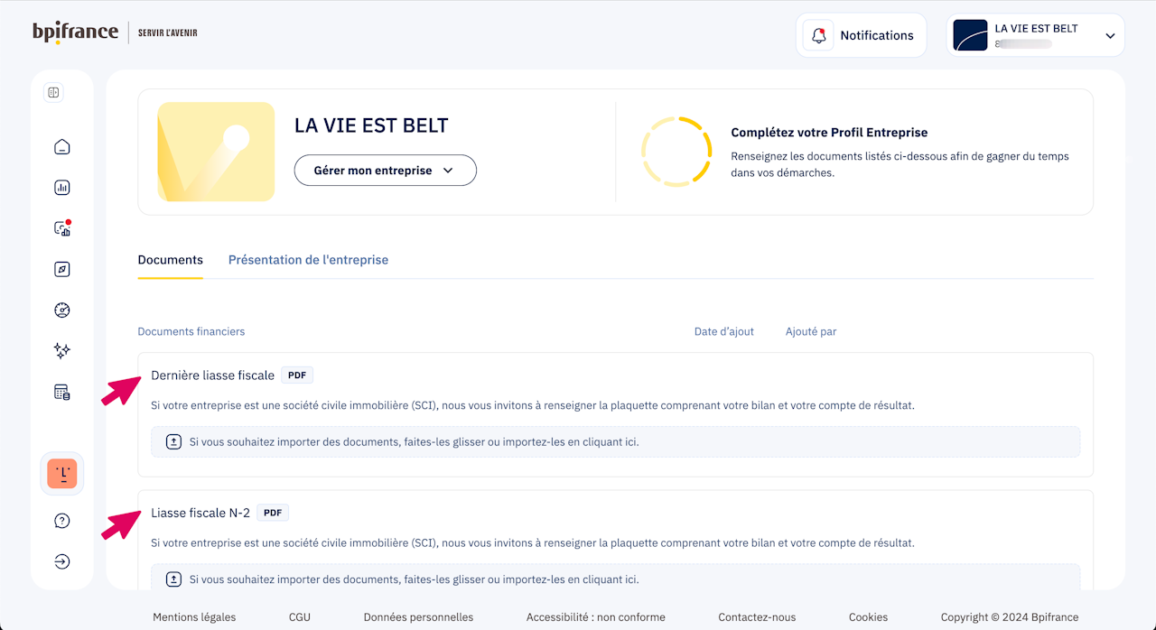 Pour cela, cliquez sur la raison sociale de votre entreprise en haut à droite de votre tableau de bord puis sur “Mon entreprise”. Vous pouvez mettre à jour vos documents financiers afin de les sauvegarder.