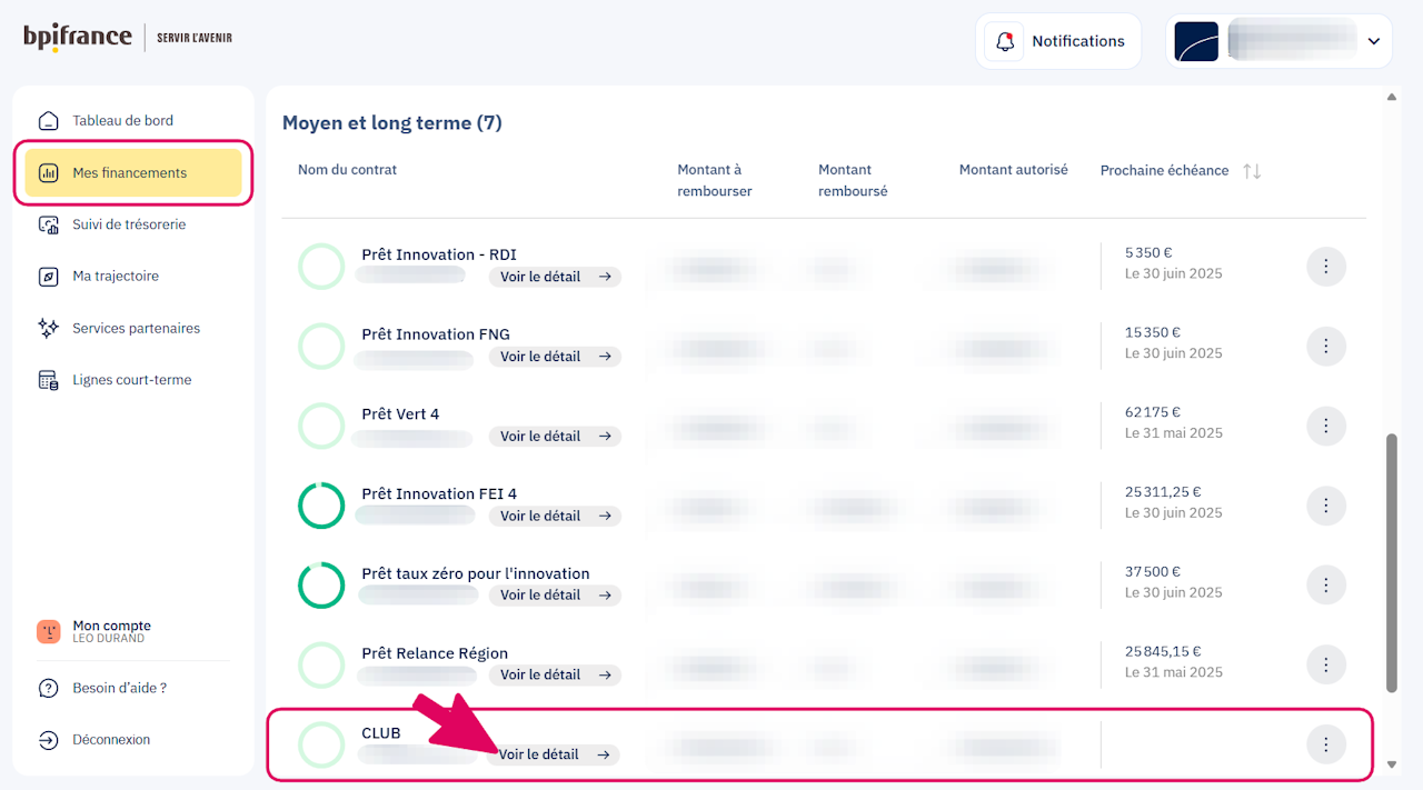 Afin d'accéder à votre contrat CLUB, veuillez vous rendre dans votre espace Mes Financements, deuxième onglet sur la gauche de votre tableau de bord Bpifrance en ligne.