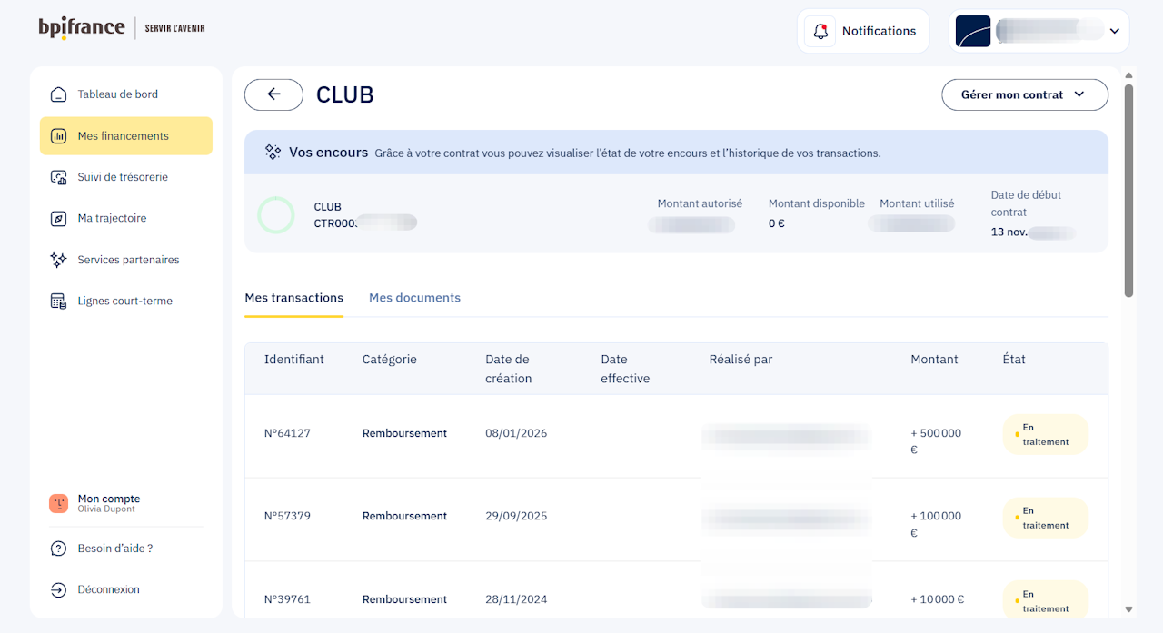 Afin d'accéder à votre contrat CLUB, veuillez vous rendre dans votre espace Mes Financements, deuxième onglet sur la gauche de votre tableau de bord Bpifrance en ligne.