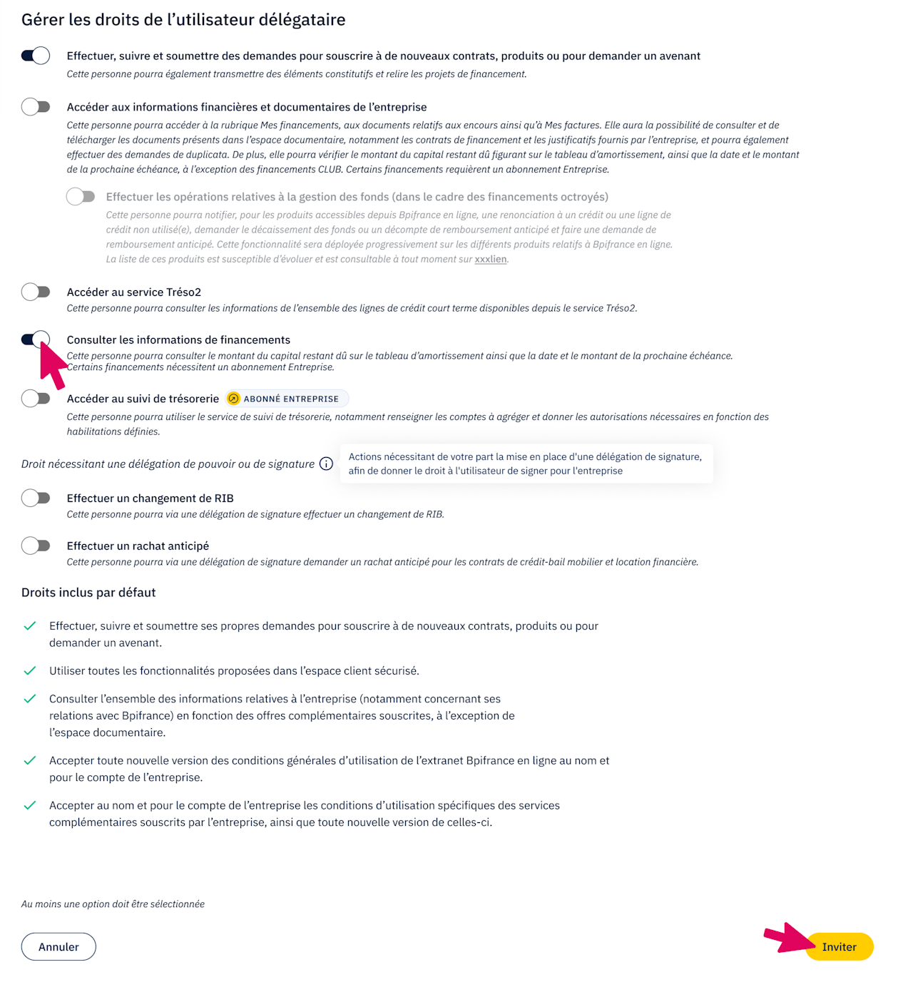 New ! Accéder au service Tréso2 | Cette personne pourra consulter les informations de l’ensemble des lignes de crédit court terme disponibles depuis le service Tréso2. |