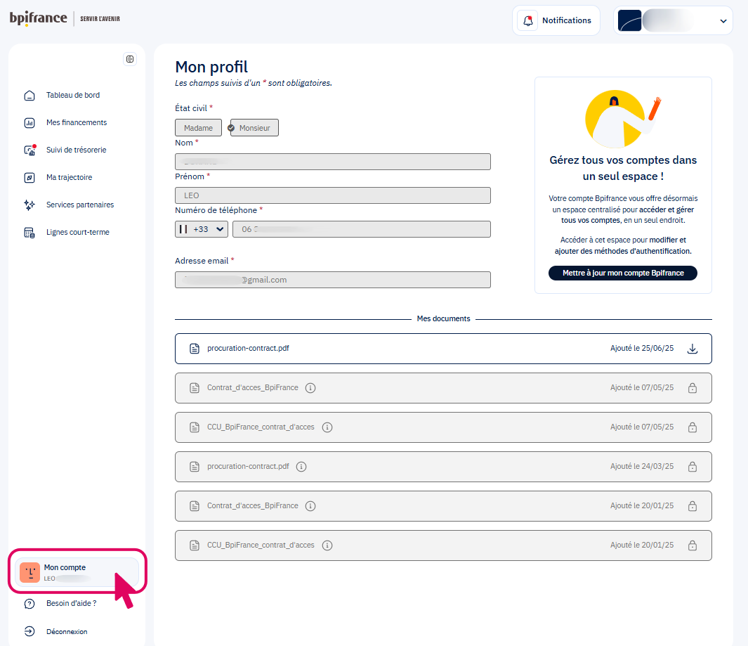 Retrouvez les informations personnelles liées à votre compte dans l'espace Mon profil : numéro de téléphone, email associé au compte, documents généraux du compte, etc.