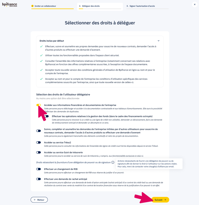 Il vous suffit de choisir les services auxquels vous souhaitez leur donner accès. Puis de signer les autorisations d'accès à l'aide d'un simple code SMS. Les délégataires recevront ainsi un mail les invitant à se créer un compte Bpifrance en ligne et accepter les droits qui leur ont été octroyés.