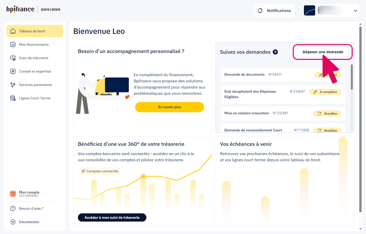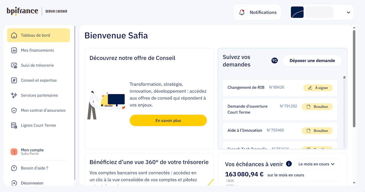 Avec votre espace Bpifrance en ligne bénéficiez de services exclusifs pour piloter votre croissance et profiter de nos solutions d'accompagnement !
