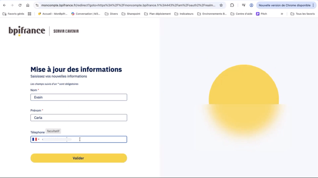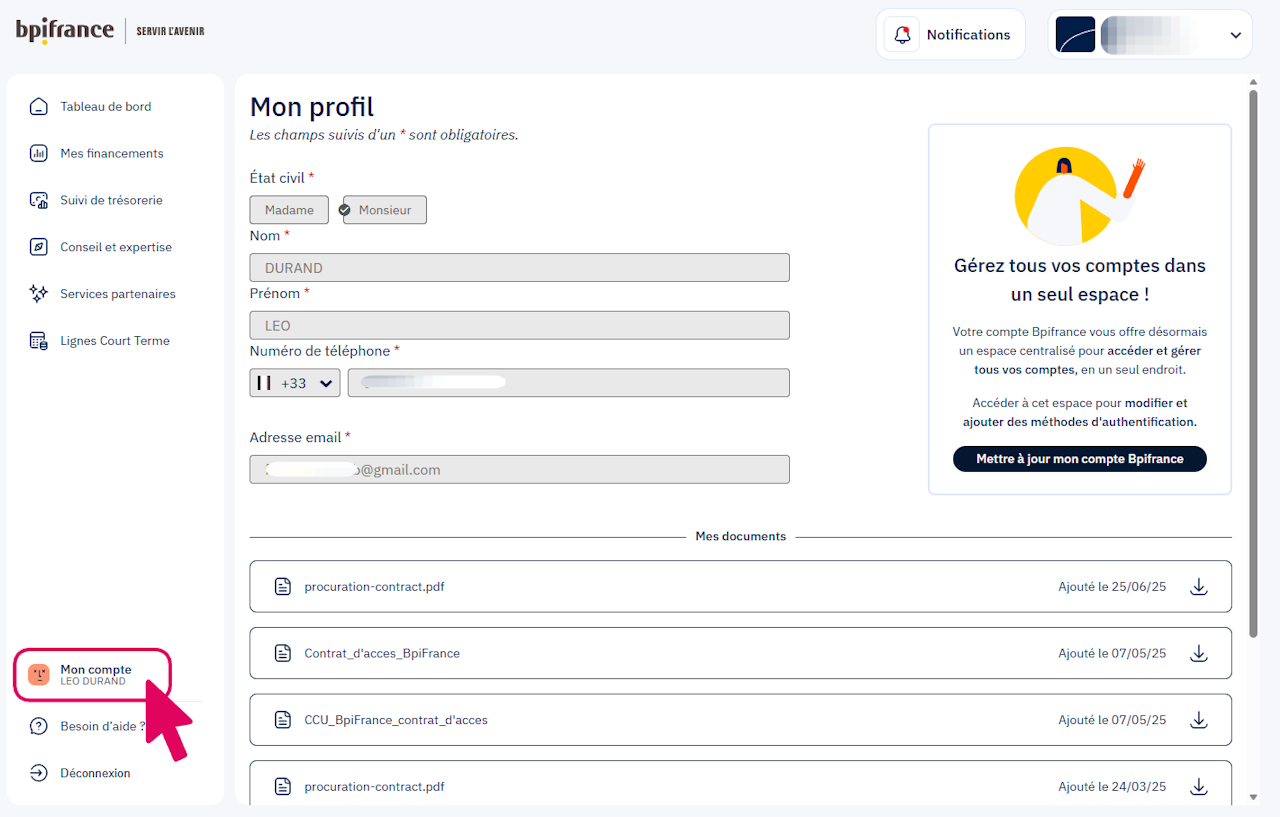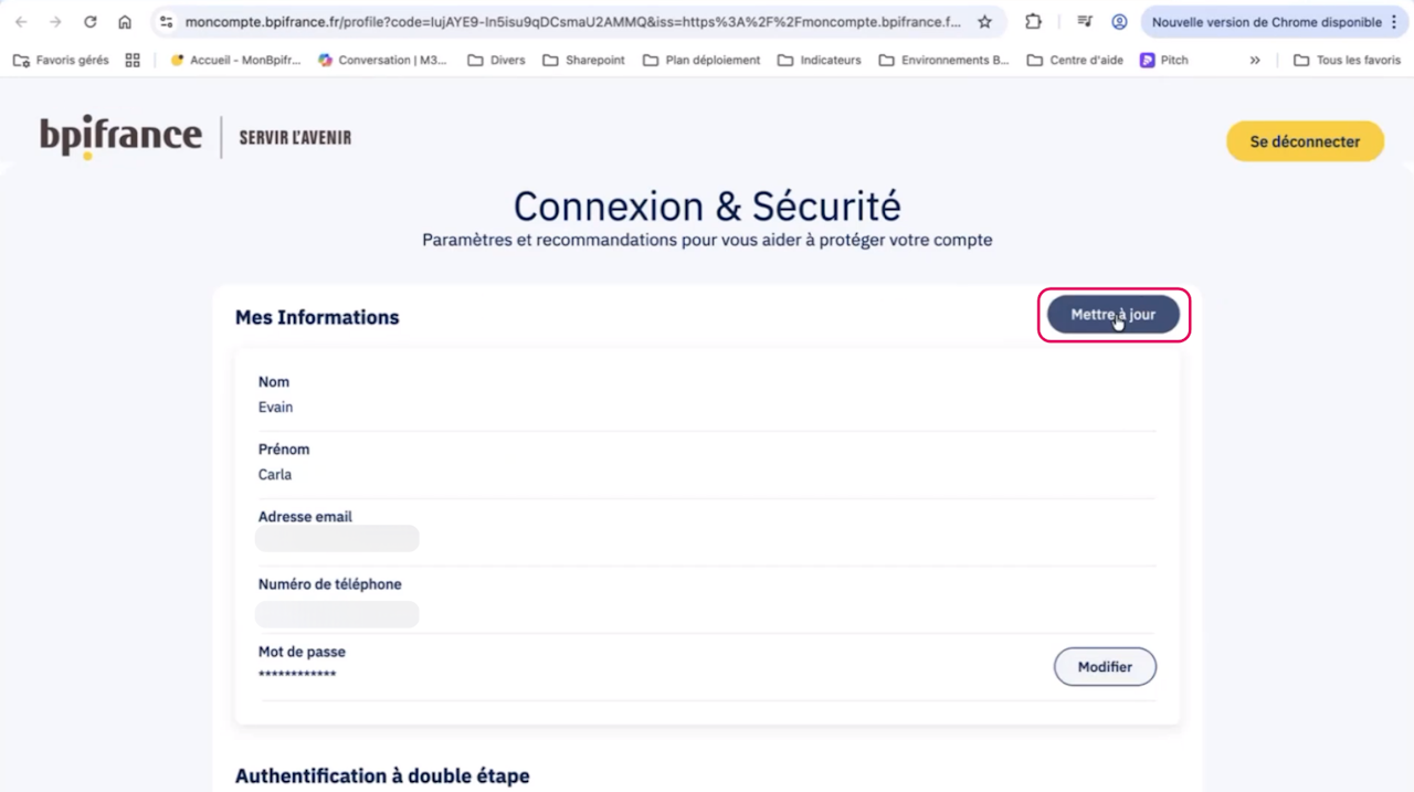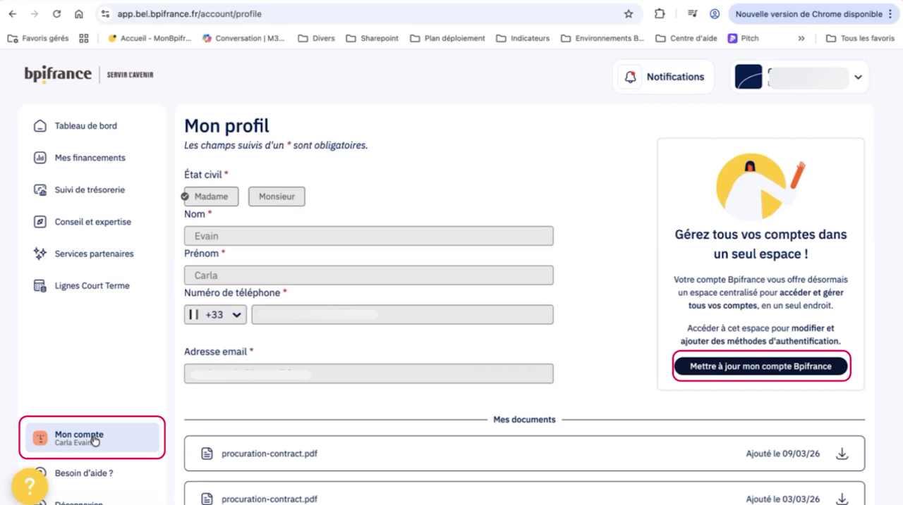 Cliquez sur Mettre à jour mon compte Bpifrance