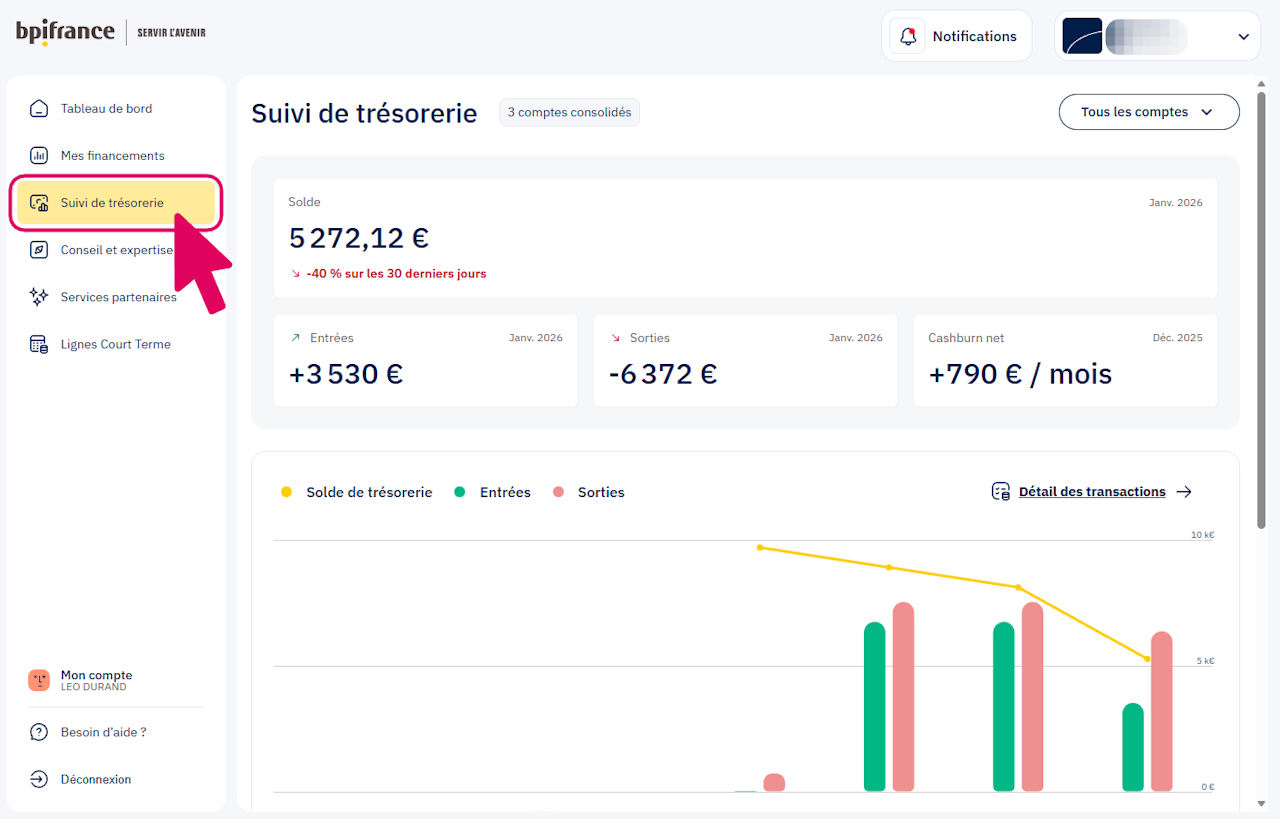 Vous pilotez votre solde consolidé avec notre outil de suivi de trésorerie.