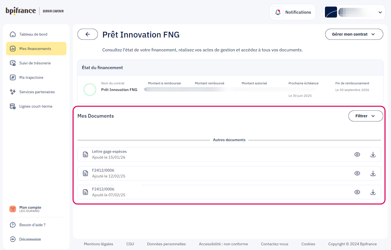 Dans l'onglet Mes Financements, sous réserve d'avoir les droits, vous retrouverez directement vos prêts en cours ainsi que les documents liés à vos prêts : factures, contrats, etc*.