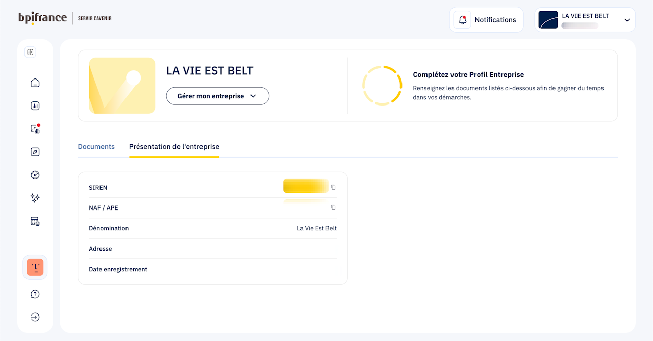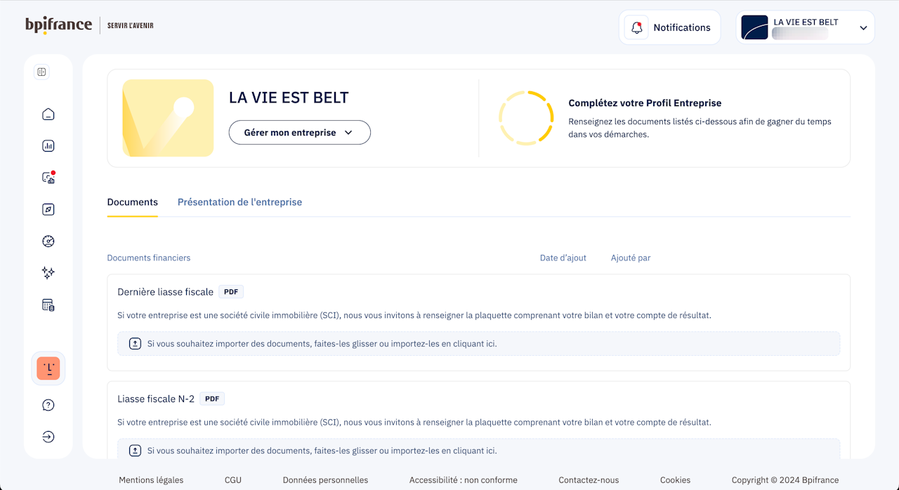 ✅ Les éléments mis à jour dans cet espace constituent la carte d’identité de votre entreprise. Ils seront accessibles aux chargés d’affaires, et permettront d’accélérer le traitement de vos futures demandes Bpifrance.