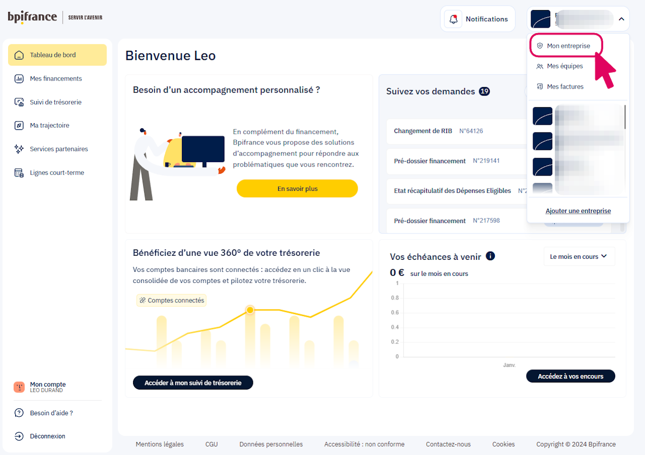 Pour accéder à votre profil d'entreprise, cliquez sur la raison sociale de votre entreprise en haut à droite de votre tableau de bord, puis sur Mon entreprise..